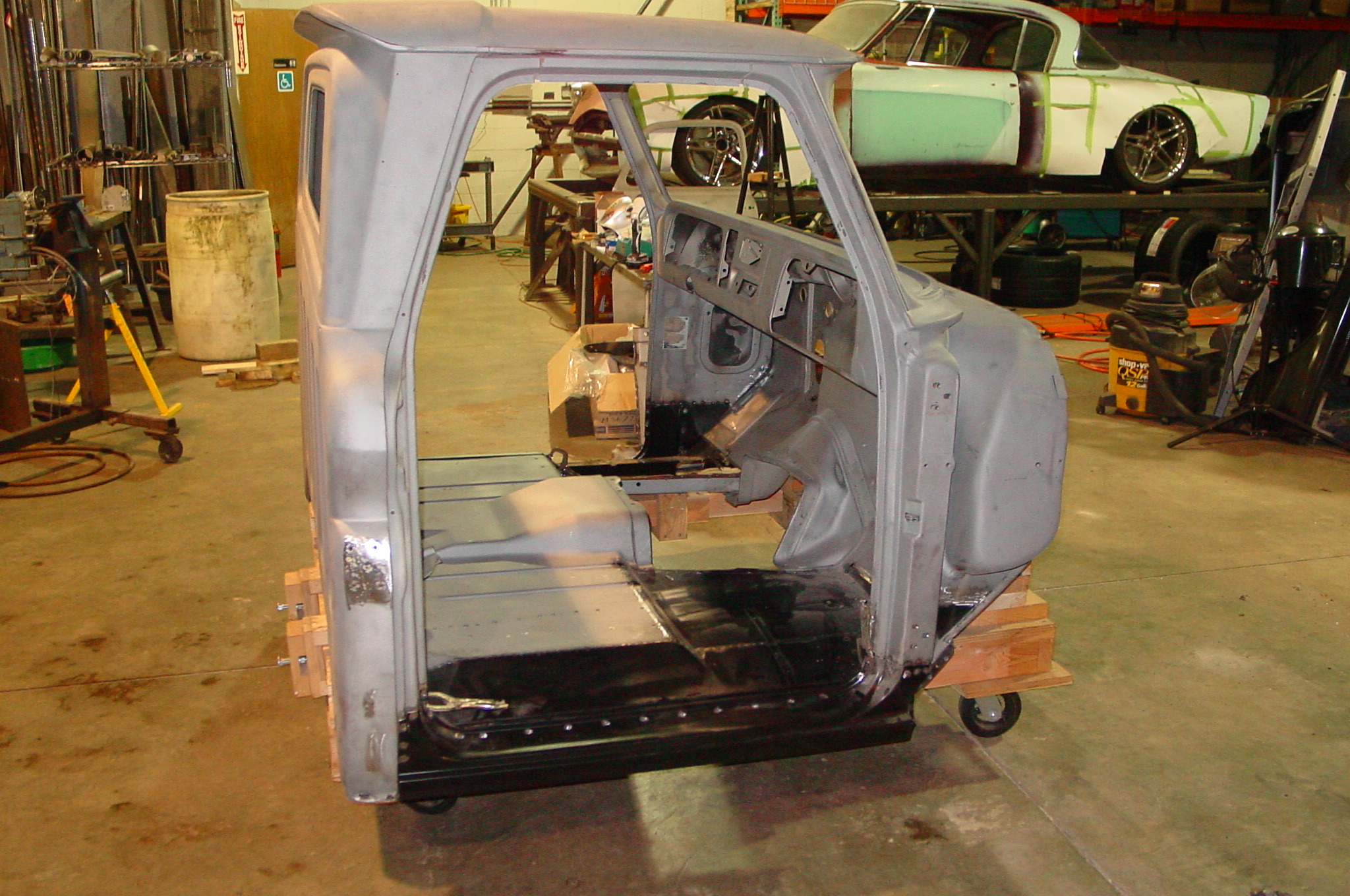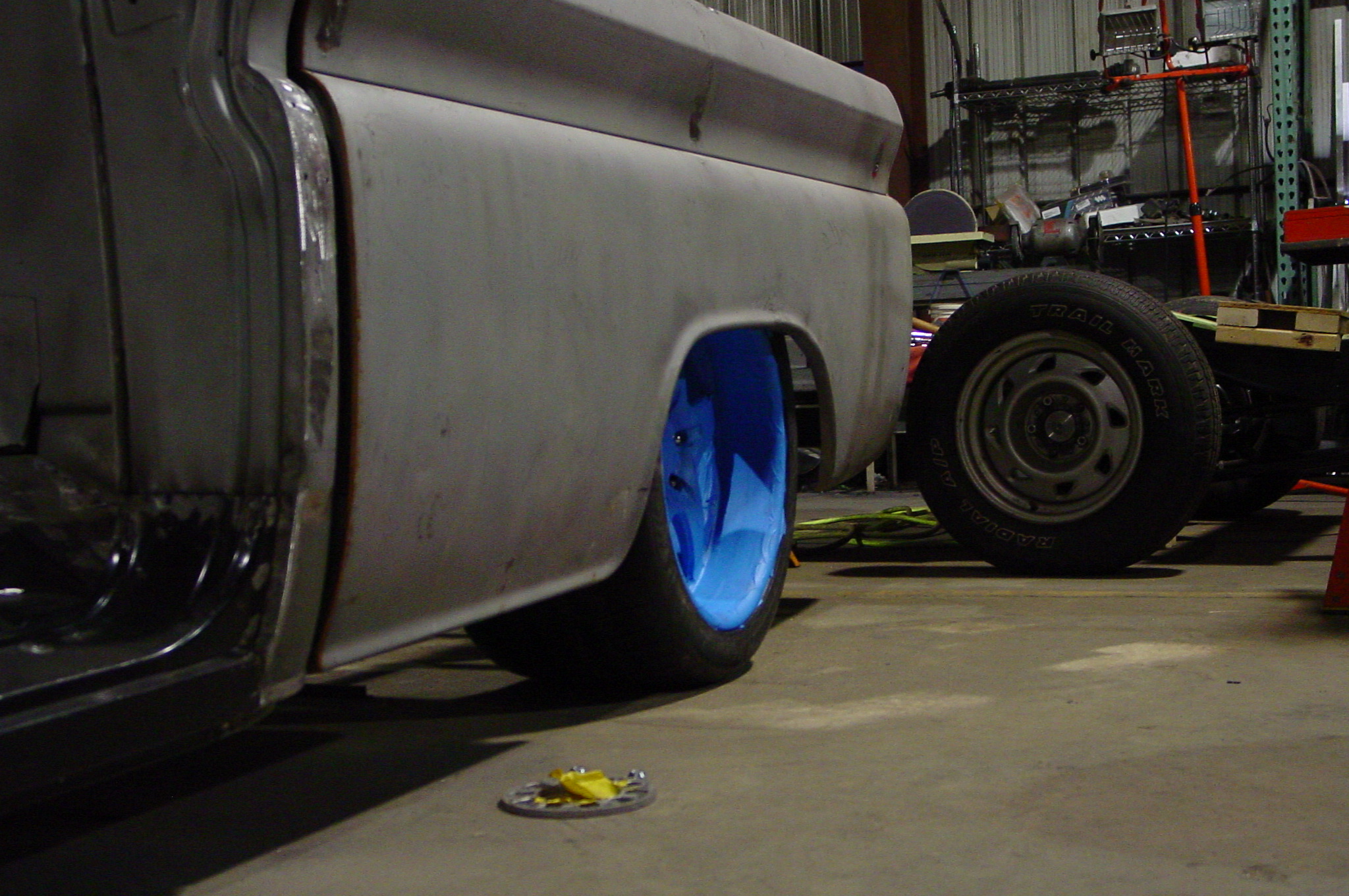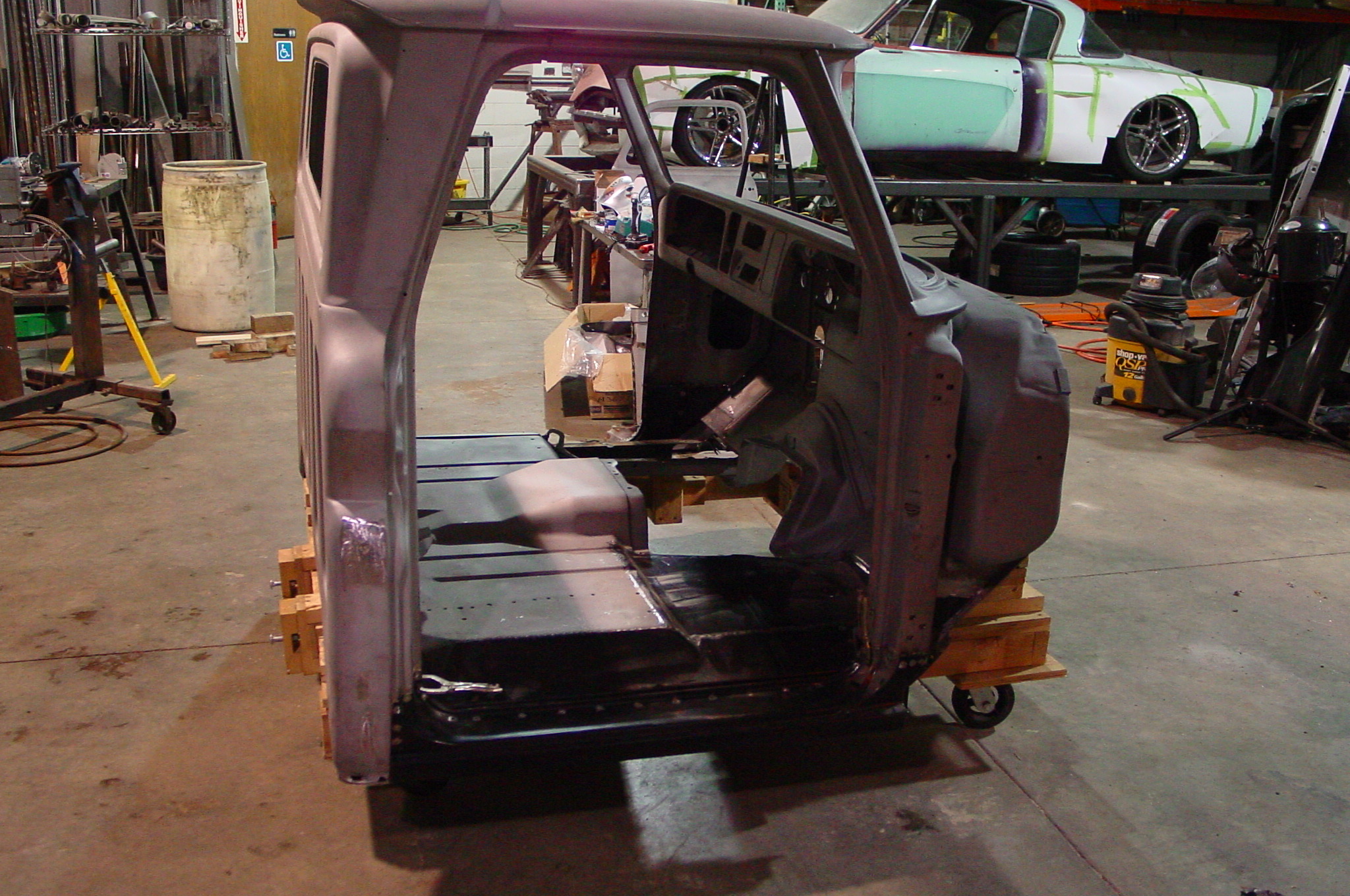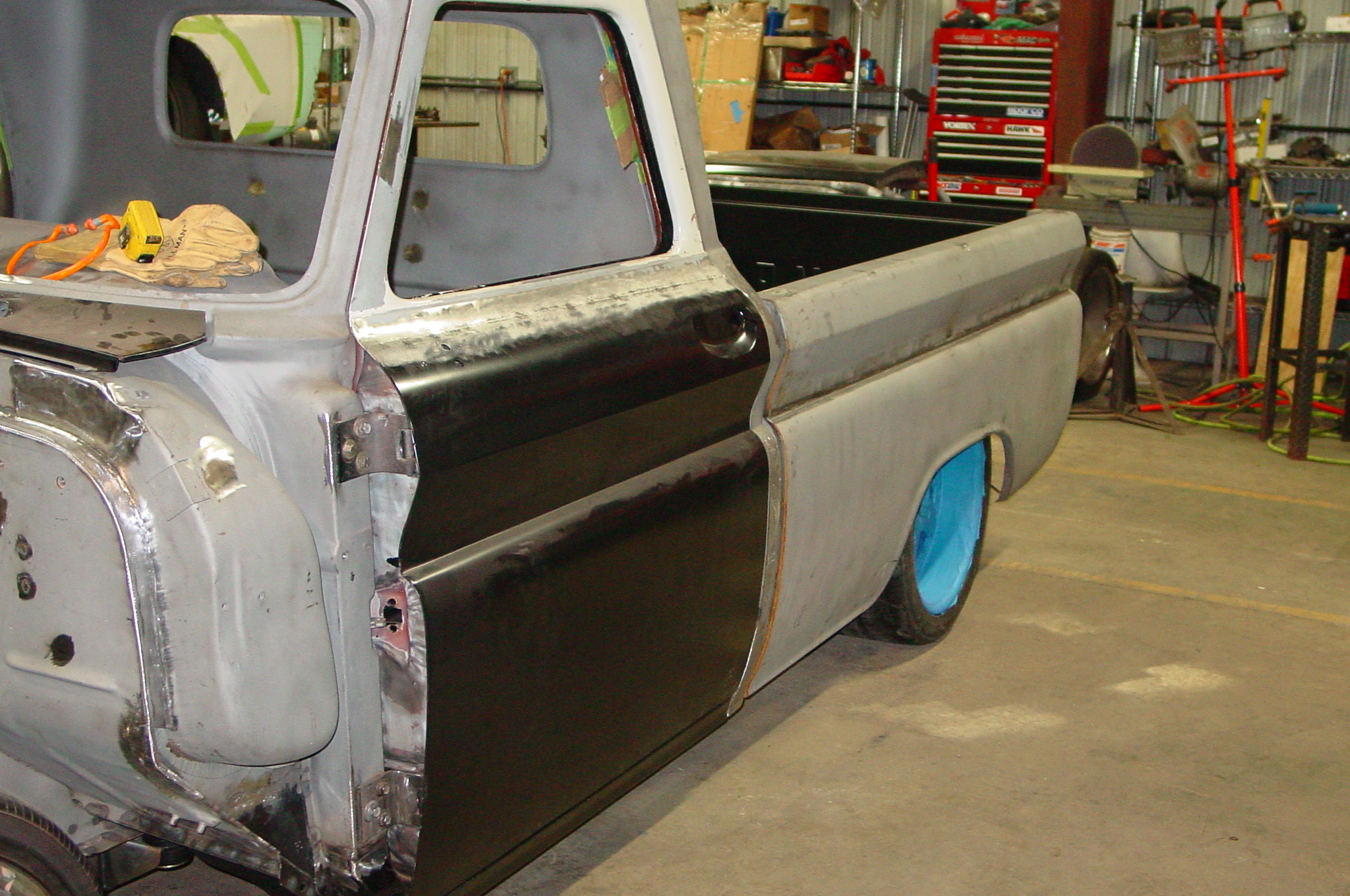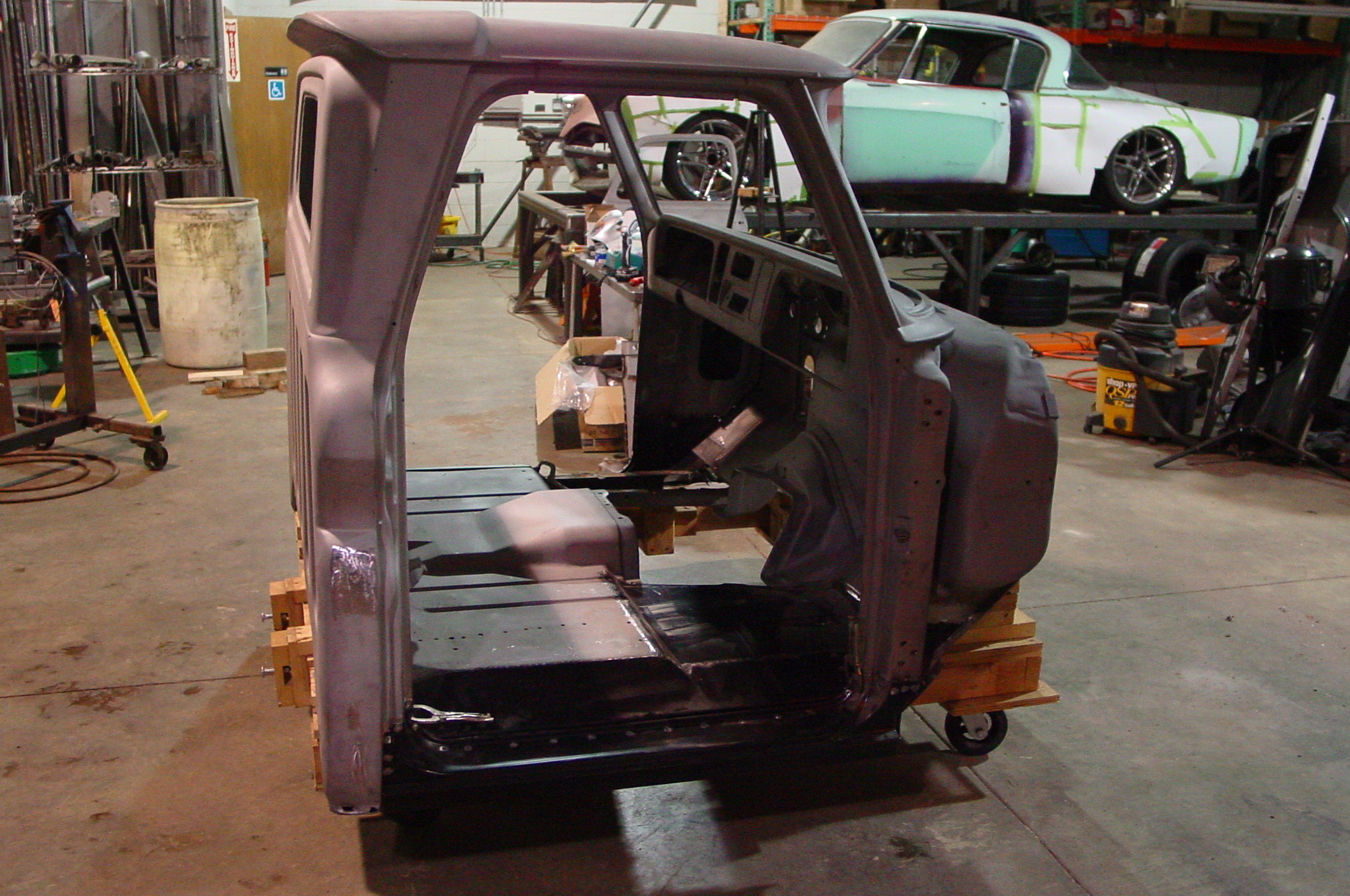 After blasting the old paint off we found a lot of filler over the rust holes. We removed the old rusted metal and replaced them with new steel. Now that the body is solid, the modifications have begun. -- Firewall, inner fenders, front fenders, front bumper, rear bumper, tailgate, and rear wheel opening.