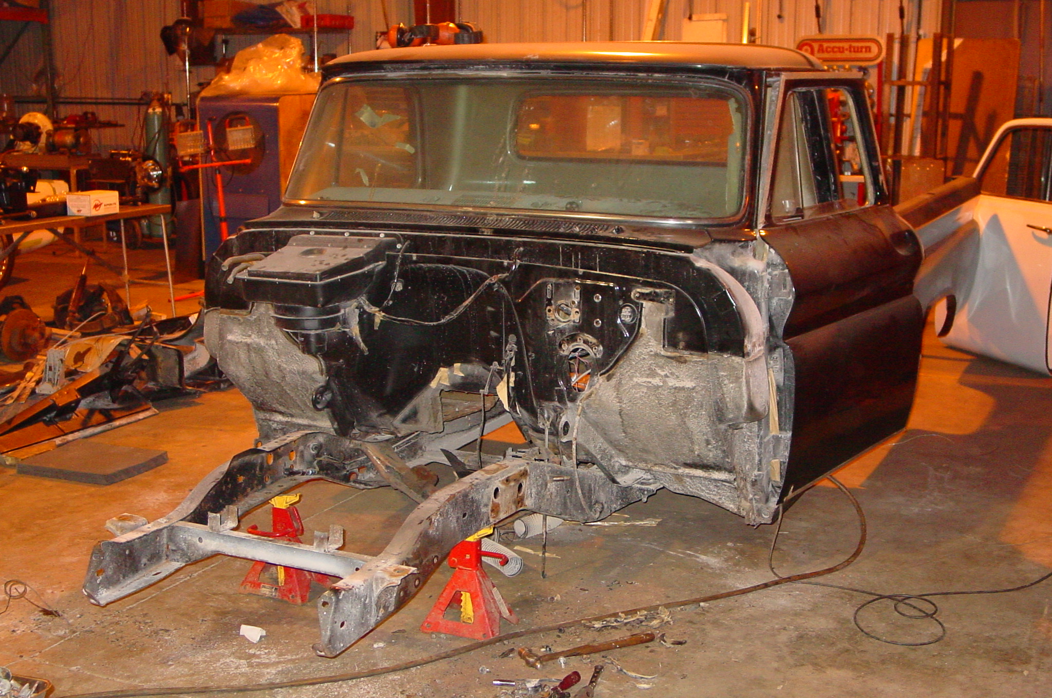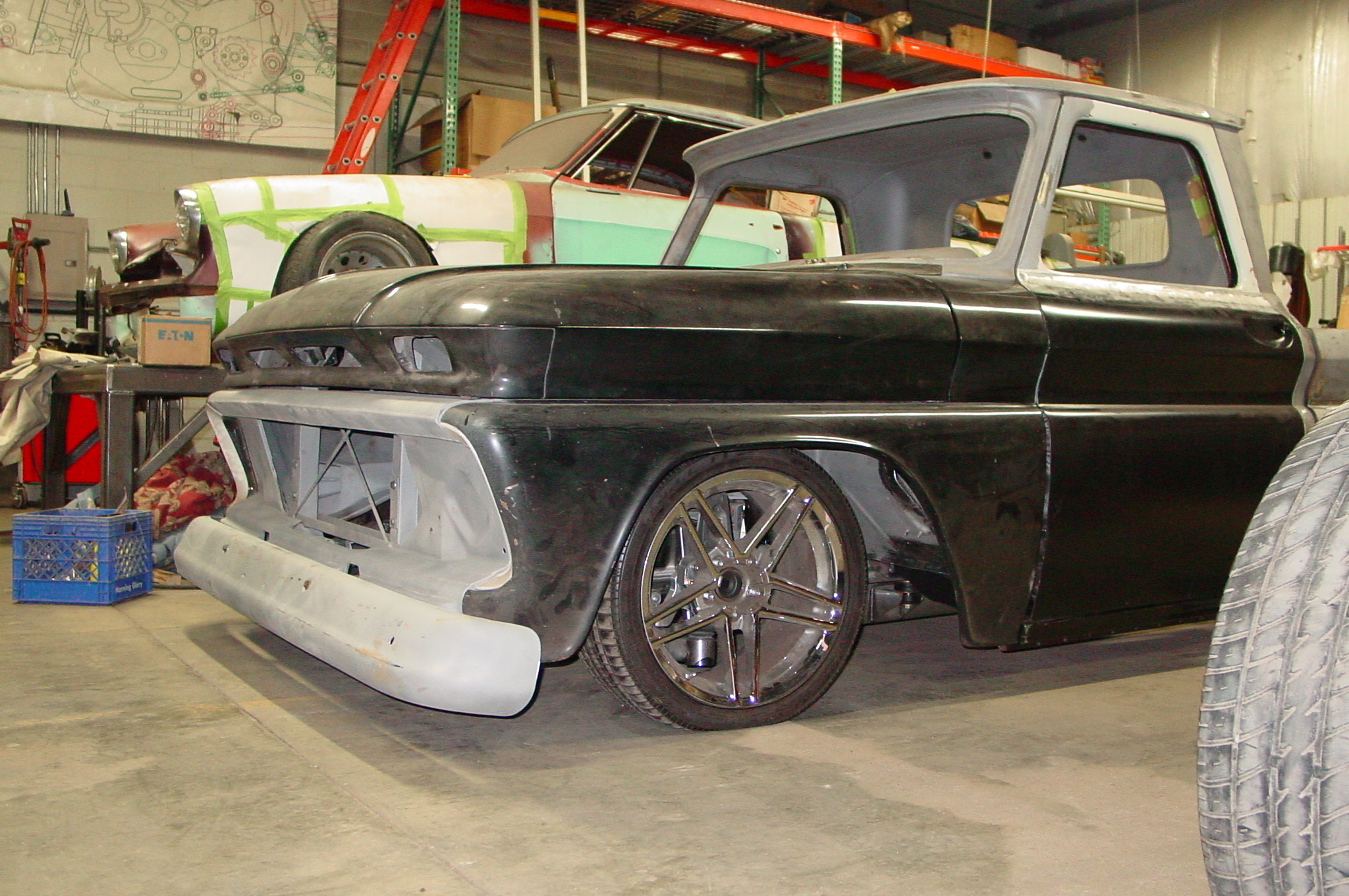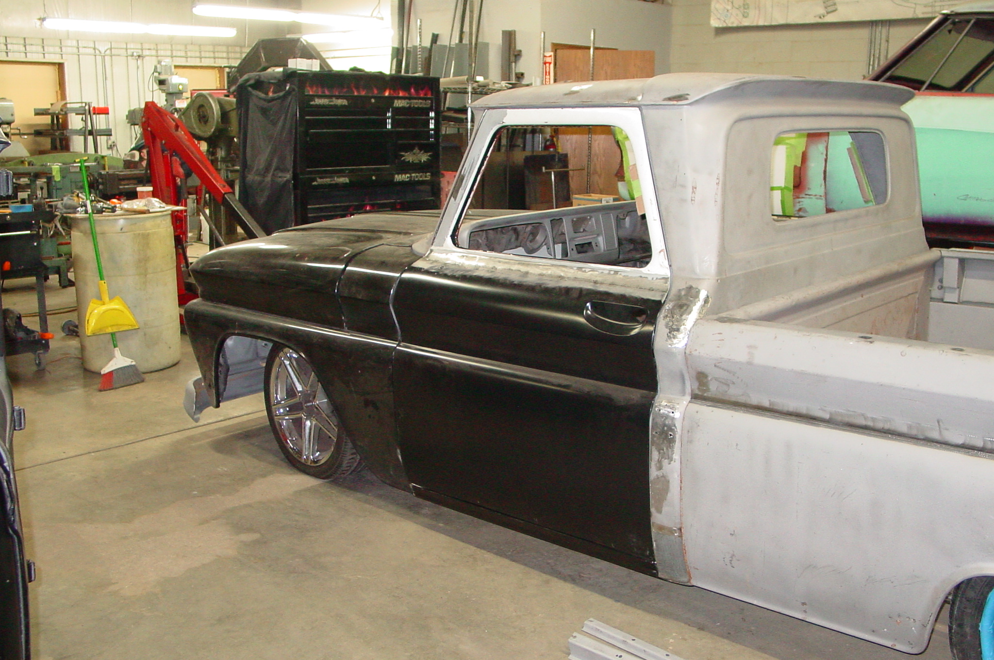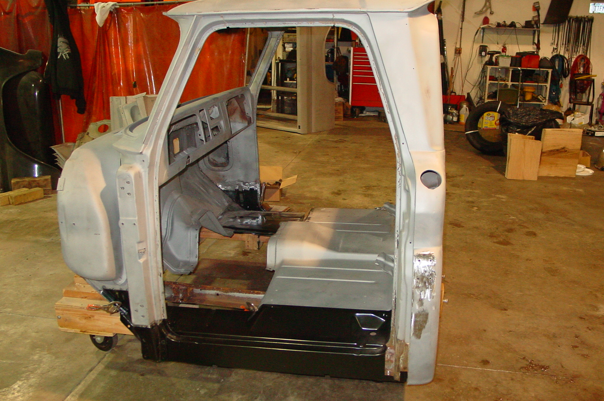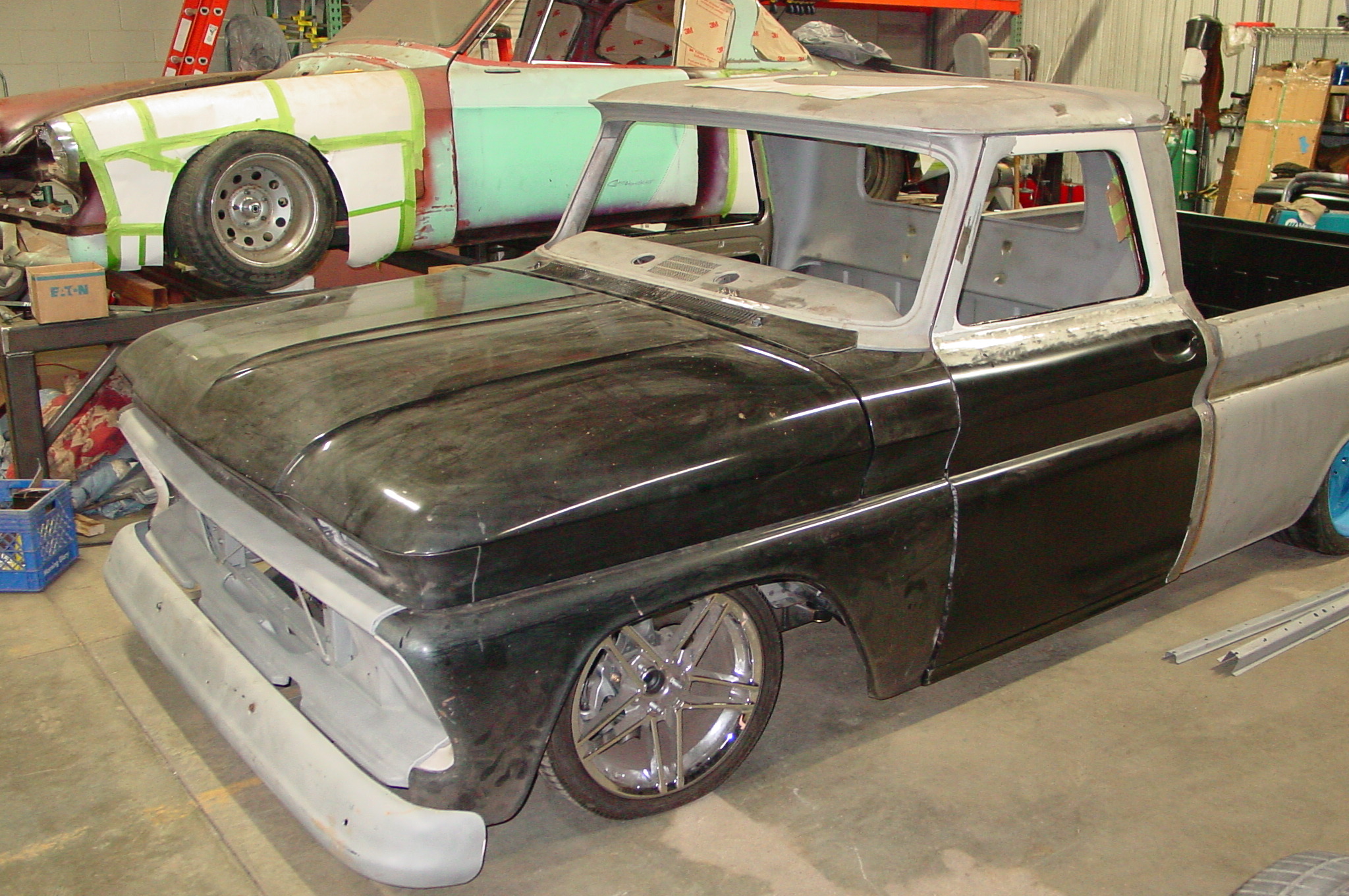After blasting the old paint off we found a lot of filler over the rust holes. We removed the old rusted metal and replaced them with new steel. Now that the body is solid, the modifications have begun. -- Firewall, inner fenders, front fenders, front bumper, rear bumper, tailgate, and rear wheel opening.