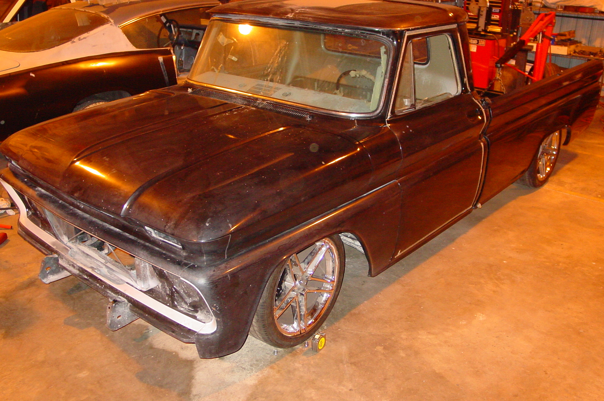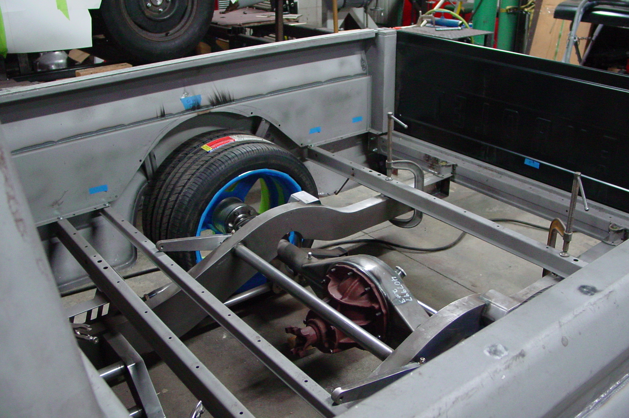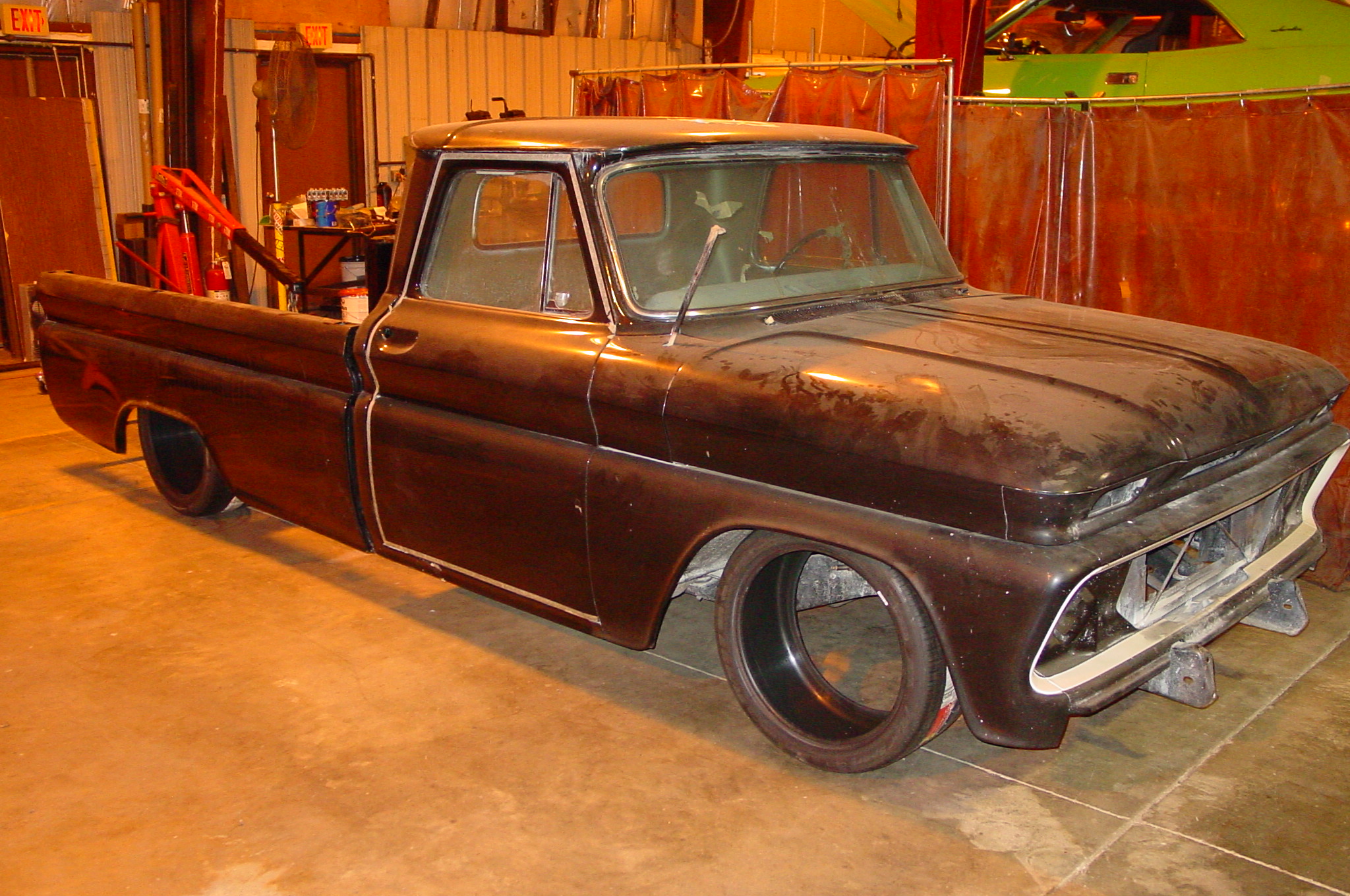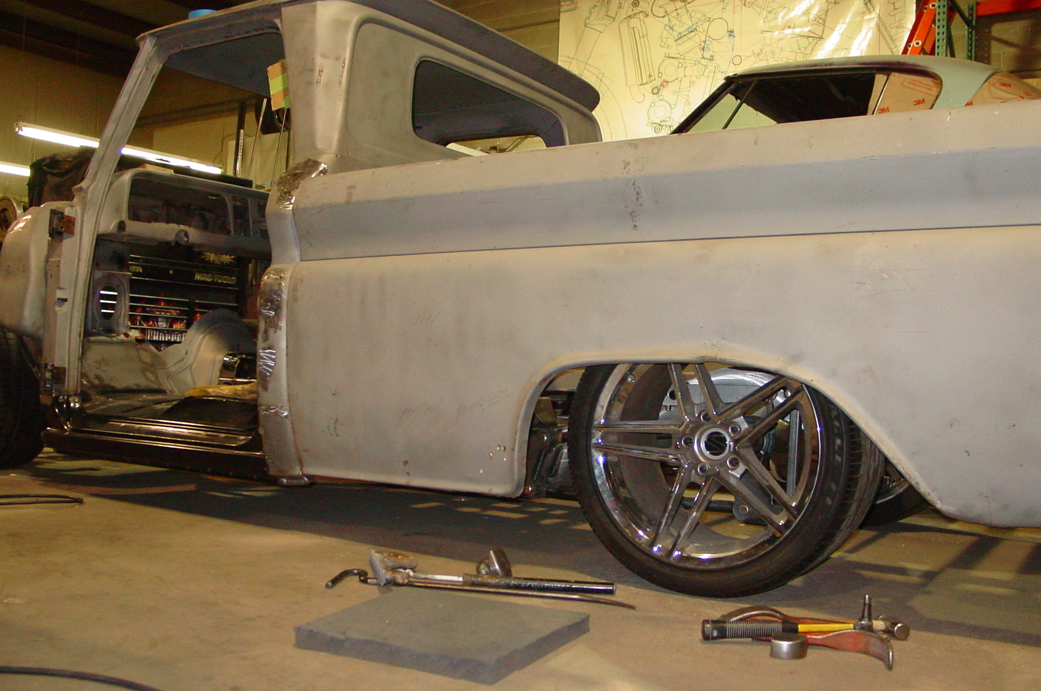 After blasting the old paint off we found a lot of filler over the rust holes. We removed the old rusted metal and replaced them with new steel. Now that the body is solid, the modifications have begun. -- Firewall, inner fenders, front fenders, front bumper, rear bumper, tailgate, and rear wheel opening.